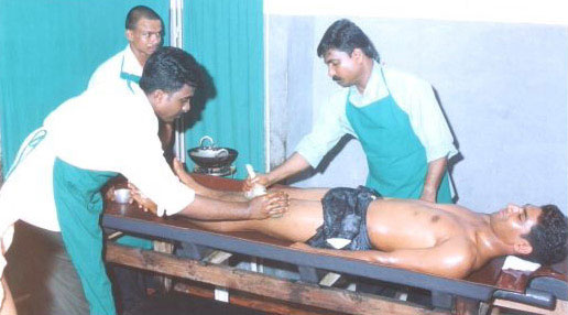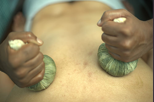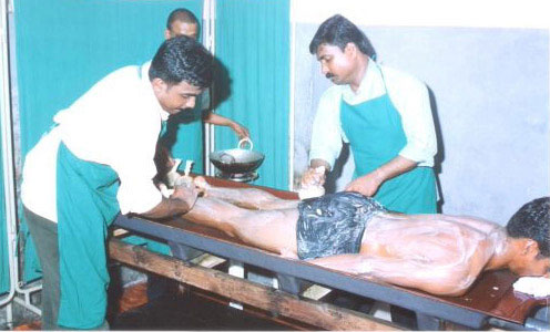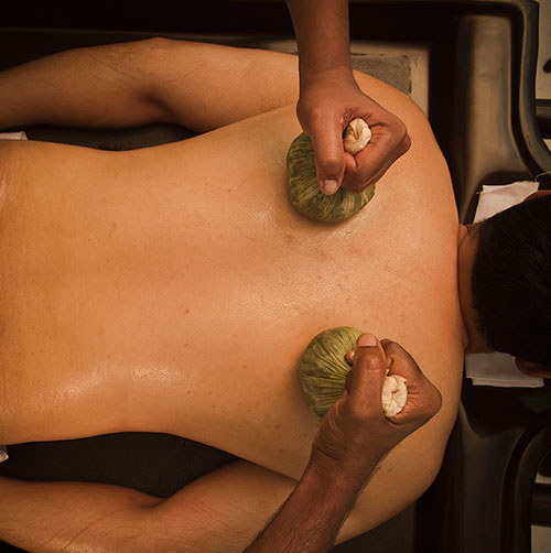 Kizhi - Massage with herbal leaves and herbal powders filled in linen pouches. Special Kizhi is administered for spinal cord related problems caused by accidents.